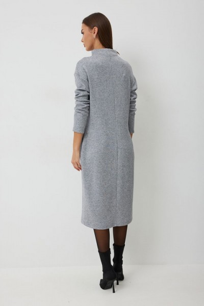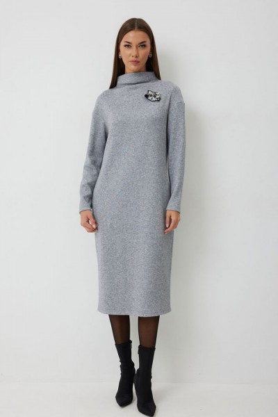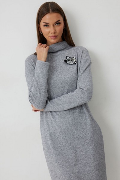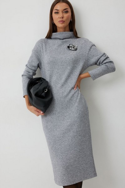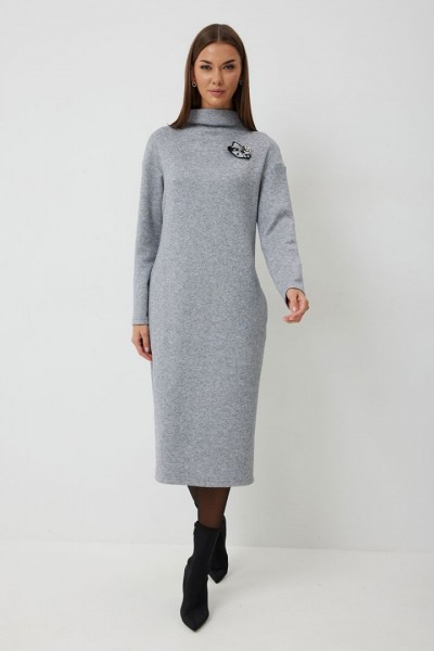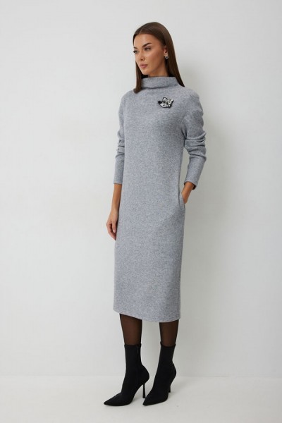 Платье трикотажное полуприлегающего силуэта с карманами в боковом шве. Длина платья до середины икры. Платье с цельнокроеной горловиной и спущенной линией плеча. Спинка со средним швом. Платье дополнено съемным авторским декором.