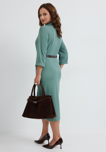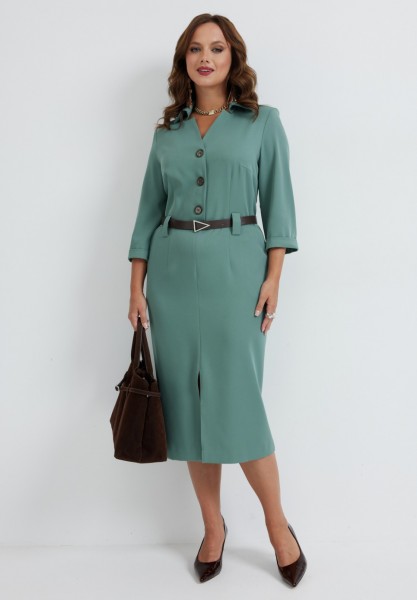 Платье полуприлегающего силуэта, выполненное из плательной поливискозы, длиной 'мидакси". Платье отрезное по линии талии, с центральной застёжкой на петли и пуговицы. Верхняя часть переда платья с фигурной V-образной горловиной, оформленной воротником рубашечного типа. Верхняя часть платья с нагрудными и талиевыми выточками. Нижняя часть переда платья с талиевыми вытачками и со средним швом, внизу которого обработан разрез. Спинка цельнокроеная с талиевыми вытачками. В боковом шве обработана потайная молния в области талии, в области бедер обработаны карманы. Рукав втачной, с цельнокроеной манжетой, длиной 3/4. В комплект к платью входит контрастный ремень с декоративной пряжкой.