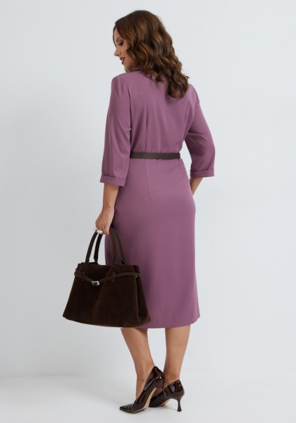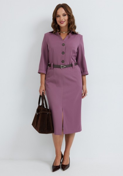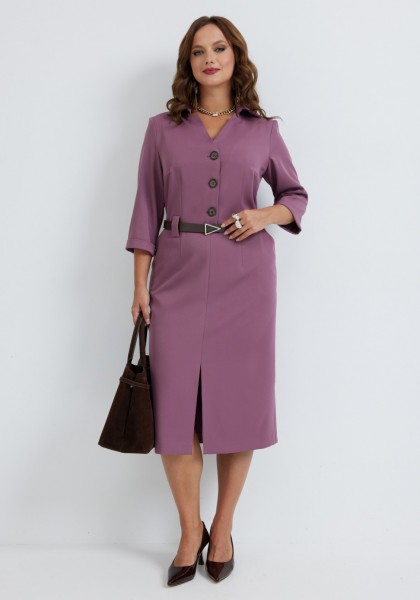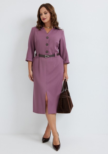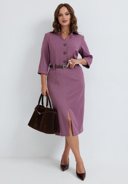 Платье полуприлегающего силуэта, выполненное из плательной поливискозы, длиной 'мидакси". Платье отрезное по линии талии, с центральной застёжкой на петли и пуговицы. Верхняя часть переда платья с фигурной V-образной горловиной, оформленной воротником рубашечного типа. Верхняя часть платья с нагрудными и талиевыми выточками. Нижняя часть переда платья с талиевыми вытачками и со средним швом, внизу которого обработан разрез. Спинка цельнокроеная с талиевыми вытачками. В боковом шве обработана потайная молния в области талии, в области бедер обработаны карманы. Рукав втачной, с цельнокроеной манжетой, длиной 3/4. В комплект к платью входит контрастный ремень с декоративной пряжкой.
