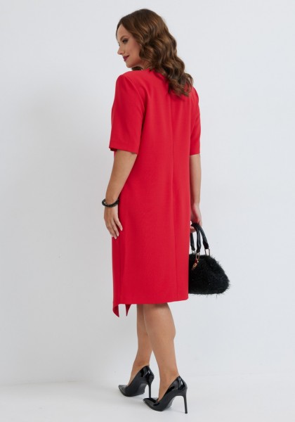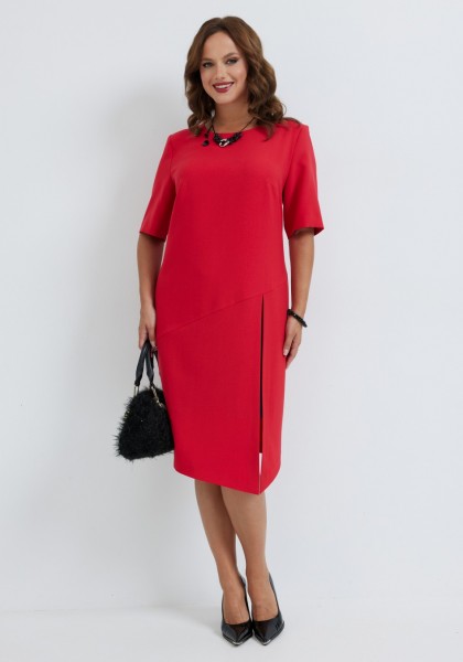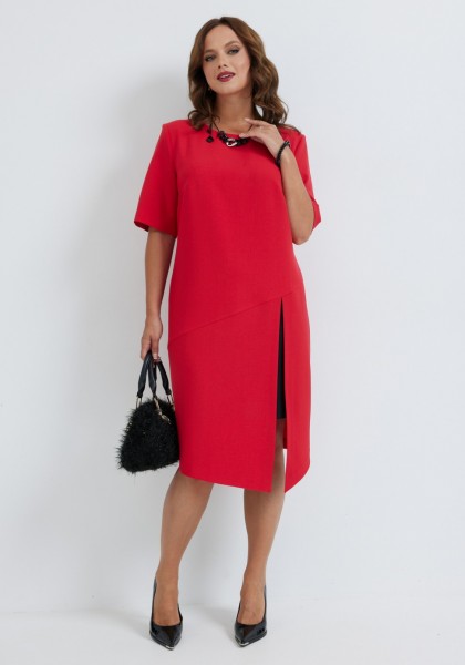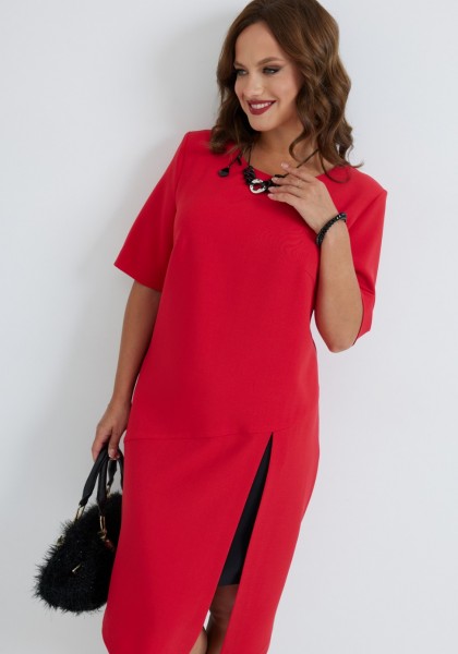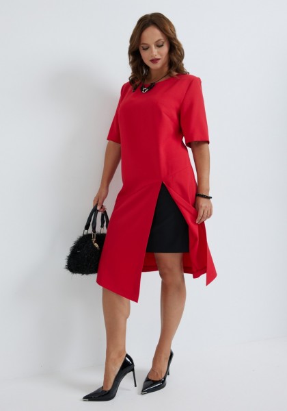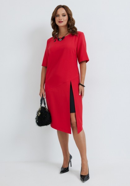 Эффектное платье прямого силуэта, выполненнное из поливискозы двух цветов. Перед платья с круглой горловиной и нагрудными вытачками. Перед платья в области бедра с косым подрезом. Нижняя часть переда состоит из верхней и нижней юбки. Верхняя юбка с косым низом и разрезом. Нижняя юбка из ткани контрастного цвета, имитирующая вторую юбку. Спинка с потайной молнией в среднем шве. Рукав втачной, длиной до линии локтя. В комплект к платью входит декоративная подвеска.