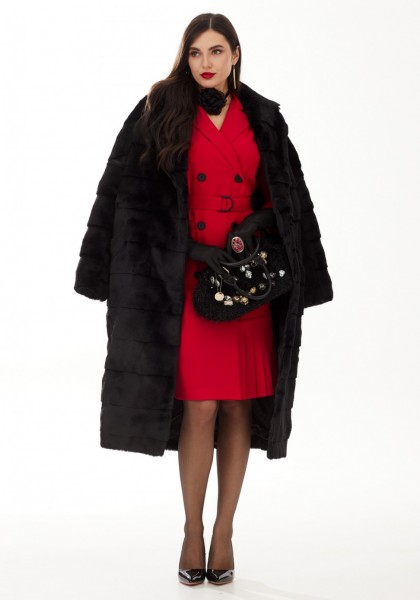 Платье женское полуприлегающего силуэта с двухбортной застёжкой на петли и пуговицы. По переду расположены нагрудные вытачки. На левой части переда - горизонтальный подрез с планкой. Нижняя часть оформлена заутюженными складками, направленными к боковому шву. По правой части переда, в области бедер, расположен горизонтальный прорезной карман с листочкой и клапаном. Спинка цельная с вертикальными талиевыми вытачками. Рукав двухшовный, длиной 3/4, с манжетой по низу рукава. Горловина платья оформлена воротником жакетного типа. В комплект к платью идёт пояс из основной ткани с декоративной пряжкой.
