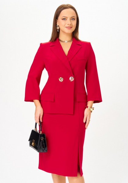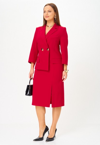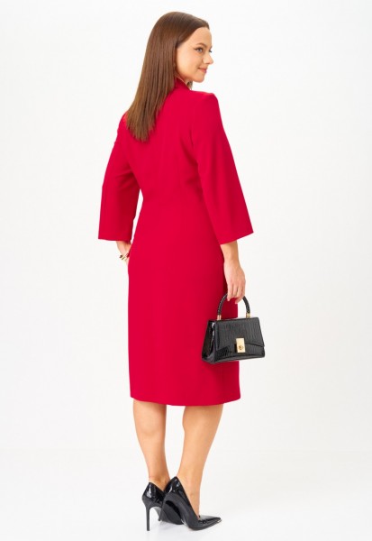 Платье прилегающего силуэта, длиной миди, выполненное из плательной поливискозы. Платье жакетного типа с ассиметричным передом. Одна из сторон переда имитирует жакет и юбку, другая-платье. Перед с талиевыми вытачками с подрезом. В области груди настрочена декоративная листочка, в области бедер - карманы-обманки с листочками и клапаном. По переду обработан разрез. В области талии расположена застёжка на 2 петли и крупные декоративные пуговицы. Спинка со средним швом, в который вставлена потайная молния. Рукав 2-х шовный втачной, длиной 3/4.