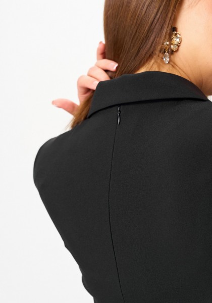 Платье прилегающего силуэта, длиной миди, выполненное из плательной поливискозы. Платье жакетного типа с ассиметричным передом. Одна из сторон переда имитирует жакет и юбку, другая-платье. Перед с талиевыми вытачками с подрезом. В области груди настрочена декоративная листочка, в области бедер - карманы-обманки с листочками и клапаном. По переду обработан разрез. В области талии расположена застёжка на 2 петли и крупные декоративные пуговицы. Спинка со средним швом, в который вставлена потайная молния. Рукав 2-х шовный втачной, длиной 3/4.