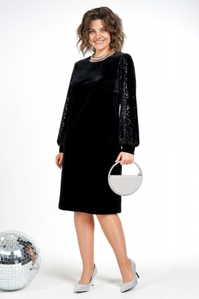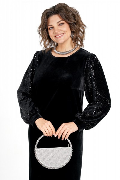 Элегантное черное платье А-силуэта из мягкого бархата, идеально подходит для вечернего выхода. Особенный акцент платья - объемные длинные рукава, украшенные пайетками, создающие эффектный блеск. Изделие дополнено втачными рукавами с собранными деталями по окату и низу, заканчивающимися элегантными манжетами. Платье снабжено потайной застежкой-молнией по среднему шву на спине, что добавляет практичности. Нагрудные выточки на переде платья обеспечивают идеальную посадку. Это платье - идеальный выбор для создания роскошного образа на любое мероприятие.