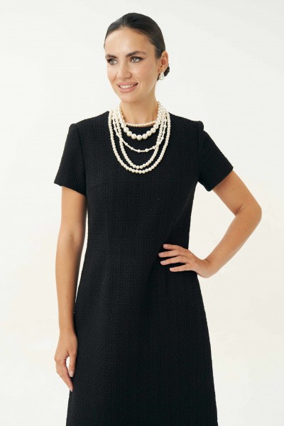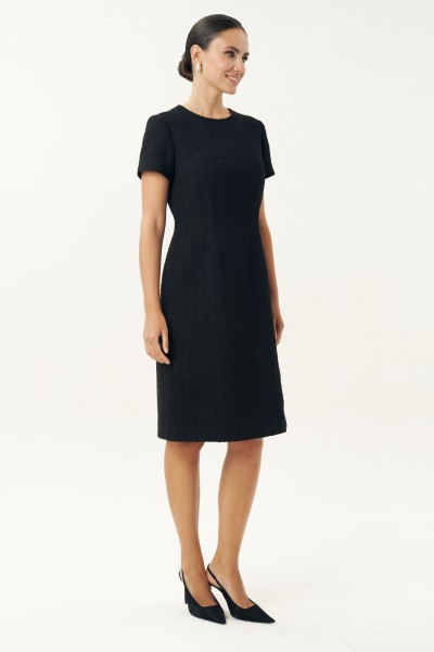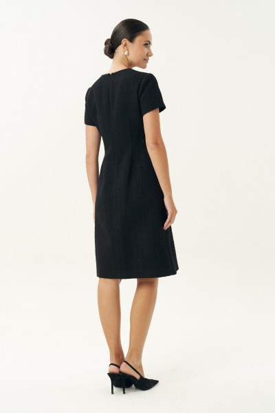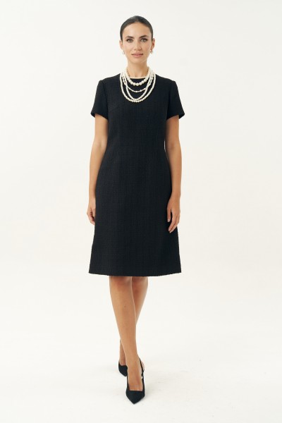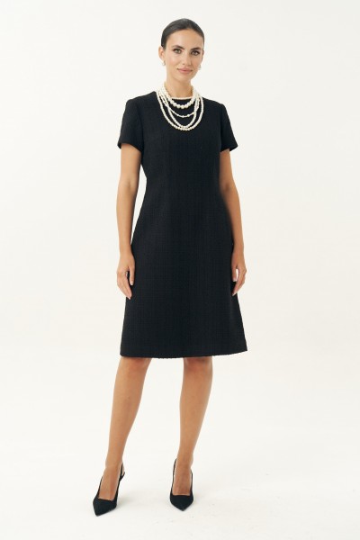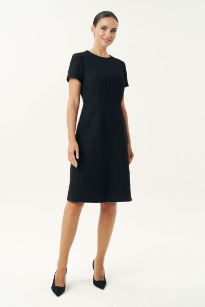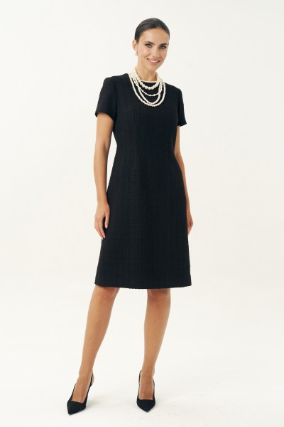 Неизменно, черное маленькое платье остается образцом элегантности… Платье женское, выполнено из костюмной твидовой ткани, полуприлегающего силуэта, расширенное к низу, на трикотажной подкладке притачной по низу переда и спинке, по низам рукавов. Платье повседневное.
