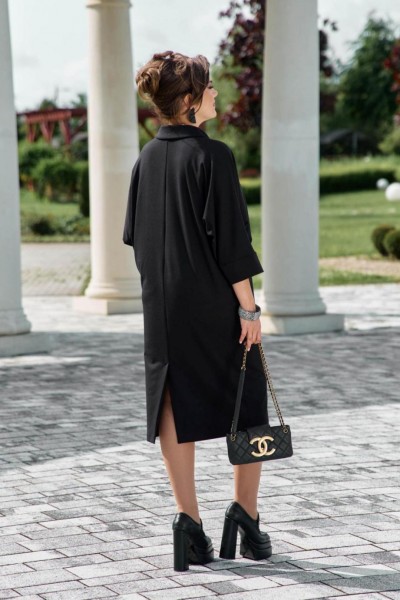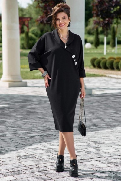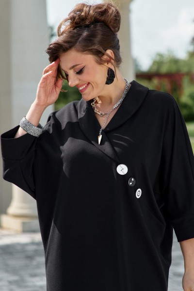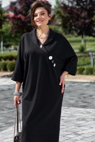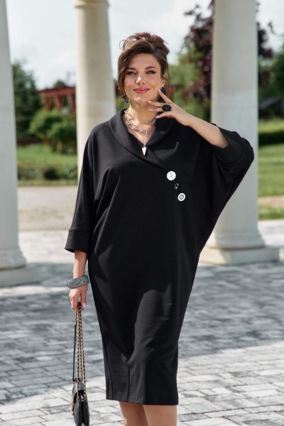 Интересный крой платья и пластические свойства трикотажного полотна помогут скрыть недостатки фигуры и создать идеальный образ. Платье свободного силуэта, заужается к низу. Горловина в платье открытая, с ассиметричным отложным воротником переходящим в подрез по переду платья. Спинка со средним швом. Рукав в платье по форме «летучая мышь» с притачной манжетой по низу. В качестве главного акцента платья, который приковывает взгляды, являются пришивные декоративные пуговицы контрастного цвета и разных размеров. Обращаем Ваше внимание, что фурнитура может незначительно отличаться от фото.