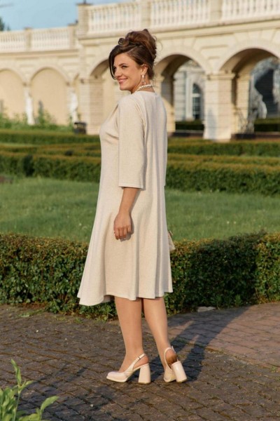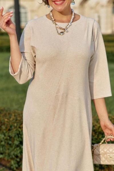Платье выполнено из высококачественного трикотажа в рубчик, известного как "лапша", это платье обеспечивает приятные тактильные ощущения и отличную посадку по фигуре. Силуэт "клеш" от талии деликатно ниспадает, создавая летящую, женственную форму, которая подчеркивает достоинства фигуры и дарит свободу движений. Горловина округлой формы, оформлена бейкой. По переду платья фигурные подрезы, позволяющие полоске в платье ложиться в разных направлениях создавая интересный образ; у плеча декоративная заложенная складка. Рукав в платье цельнокроеный. Длина миди и рукава три четверти придают платью утонченный и завершенный вид.