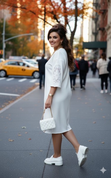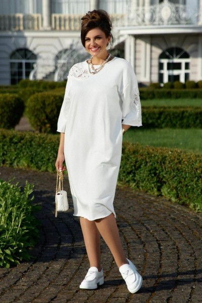 Если Вы ищете идеальное сочетание стиля и комфорта, вот идеальный выбор. Мы специально подобрали качественную и тактильно приятную ткань, которая хорошо держит свою форму, создавая ощущение легкости и свободы движения. Отделочные вставки из вышитого ришелье в тон добавляют образу романтичные нотки. Платье свободного силуэта с округлой формой горловины, линия плеча спущенная. По переду платья декоративная вставка из отделочного материала- вышивки ришелье. Спинка в платье с средним швом. Рукав втачной, длиной 7/8. В качестве дополнительного декоративного элемента в рукавах ассиметричные вставки из ришелье. Главной особенностью в изделии является эффект необработанных срезов, который добавляет образу дерзости.