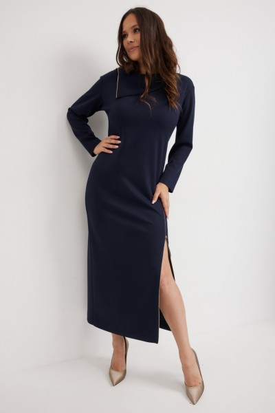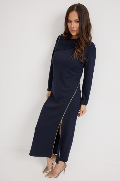 Элегантное и стильное платье миди полуприлегающего силуэта. Выполнено из приятного к телу комфортного гладкого трикотажного полотна. Рукав втачной, полной длины. Украшением платья являются функциональные тесьмы молнии. С их помощью можно стильно уложить воротник и отрегулировать вырез платья. Из лаконичного базового платье легко трансформируется в стильное и сексуальное. Длина платья от плечевого шва 127см. Длина рукава 60см.