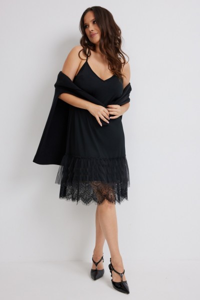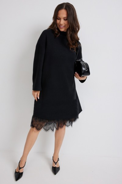 Стильный комплект из верхнего трикотажного платья и нижнего платья-комбинации. Верхнее платье свободного прямого кроя с длинным рукавом. Выполнено из приятного к телу трикотажного полотна средней плотности, который прекрасно держит форму. Нижнее платье-комбинация выполнено из нежного трикотажного полотна, дополненного красивым кружевом и фатином. Комбинация на тонких регулируемых бретелях. Длина верхнего платья от плечевого шва 81см. Длина рукава 60см. Длина нижнего платья 95см.
