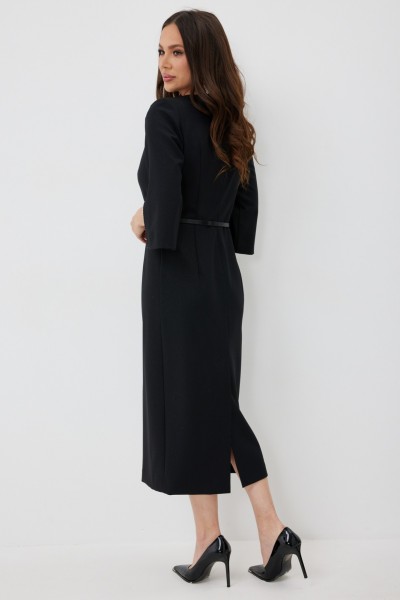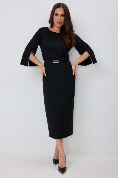 Стильное и утонченное платье прилегающего силуэта из красивой гладкой, слегка мерцающей ткани. Рукав втачной, с разрезами. Горловина округлой формы. По талии платье отрезное. По спинке застежка на потайную молнию, по низу шлица. Платье дополнено по горловине и рукавам декоративной тесьмой с жемчужной нитью. По талии дополнено красивым кожаным поясом с отделкой из жемчуга на пряжке. Длина платья от плечевого шва 126см. Длина рукава 47см.