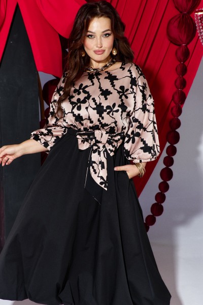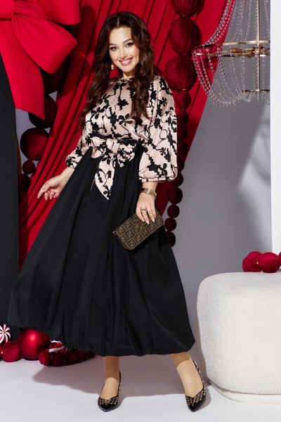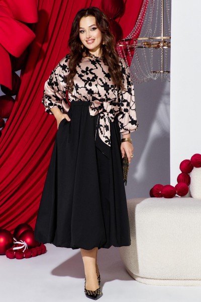 Невероятно красивое и элегантное платье отвечает всем требованиям вечернего наряда! Сочетание тканей разных фактур и дизайнов в одной модели - тренд сезона. Для лифа с мягкими присборенными рукавами мы выбрали пластичный атлас, а формоустойчивую тафту - для создания модной юбки «баллон». Сдержанный блеск атласа с деликатным принтом подчеркивает глубину тона черной тафты. Платье отрезное по талии, с круглой горловиной. Рукав длиной 7/8 со спущенной проймой и сборкой по низу на резинку. Длинная юбка «баллон» собирается по талии на эластичную ленту в отрезном поясе. По поясу платье декорировано бантом в виде съемной броши.