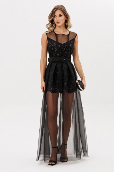 Платье выполнено из органзы. Платье Х-образного силуэта, длиной в пол. Платье отрезное по линии талии. Спереди встречная складка со сборкой по центру. Горловина округлой формы. Лиф с V-образным вырезом, нижняя юбка прямого силуэта, длиной выше линии колена, выполнены из гипюра на подкладке из атласа телесного цвета. Верхняя юбка расширенная к низу со складками по переду и спинке. По центру переда разрез от талии до низа. В комплект входит съемный ремень из атласа с обтяжной пряжкой и блочками.
