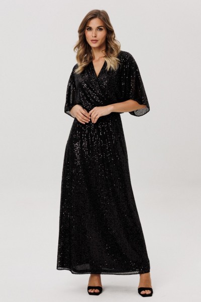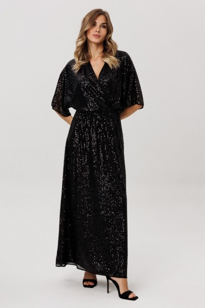 Платье выполнено из трикотажного полотна в пайетки. Платье X-образного силуэта, длиной миди, отрезное по линии талии. Лиф покроя кимоно. Перед выполнен на запах. Горловина V-образной формы. Переднее и заднее полотнище цельные и расширенные к низу. По линии талии эластичная тесьма. Платье на отлетной по низу трикотажной подкладке.