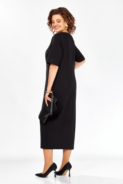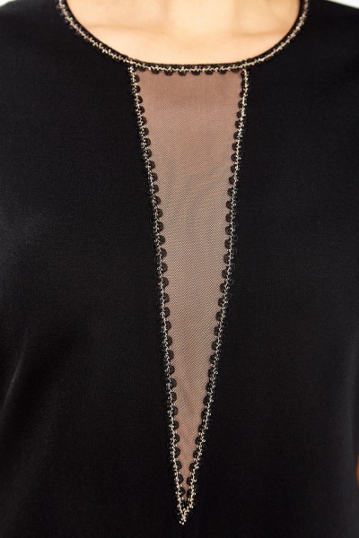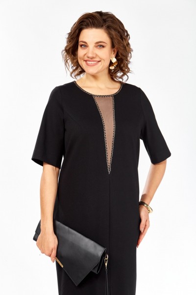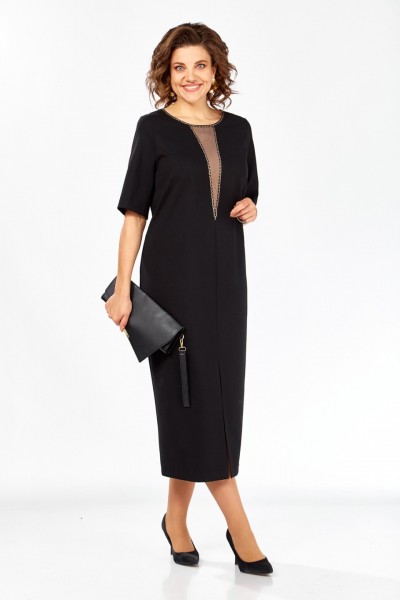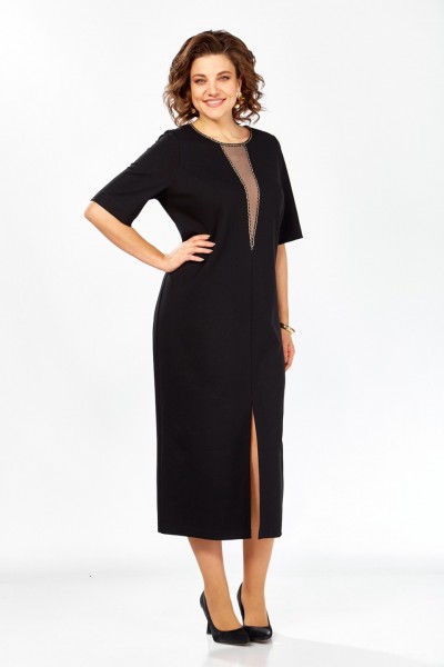 Платье женское, нарядное, полуприлегающего силуэта выполнено из трикотажного полотна. Горловина круглой формы. По переду обработаны нагрудные вытачки и фигурная вставка из отделочной ткани. По горловине и вставке декоративная тесьма. По переду в среднем шве внизу обработан разрез. Спинка с талиевыми вытачками и со средним швом, в котором обработана застежка на навесную петлю и пуговицу. Рукава втачные, длиной до локтя.