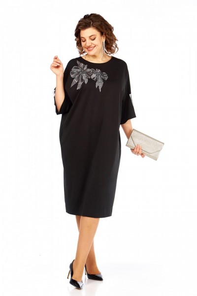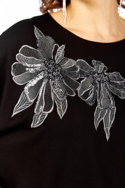 Платье женское нарядное, изготовлено из трикотажного полотна. Горловина круглой формы. На полочке дизайнерская вышивка. Спинка со средним швом и декоративным вырезом с сеткой вверху. Рукава спущенные, длиной ¾ со вставкой из сетки.