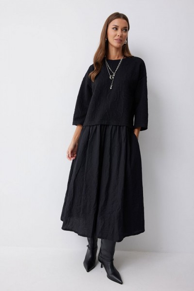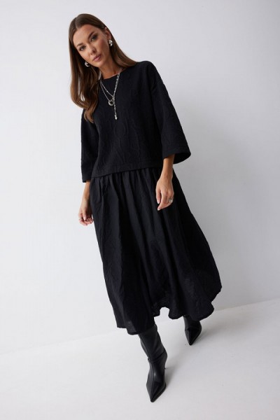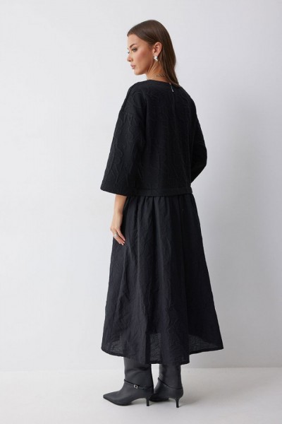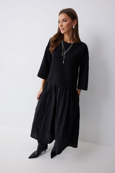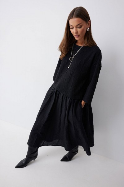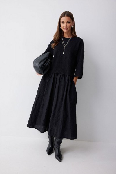 Платье А-силуэта из трикотажного полотна комбинированного хлопковой тканью. Горловина округлая, на спинке застежка на молнию. Рукав со спущенной линией плеча, длиной 7/8. Под линией талии подрез, в подрез вставлена юбка из хлопка. В боковых швах карманы. Платье частично на подкладке.
