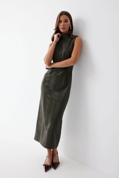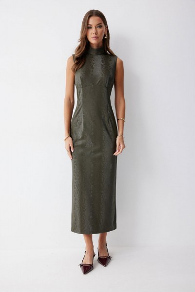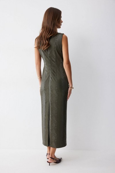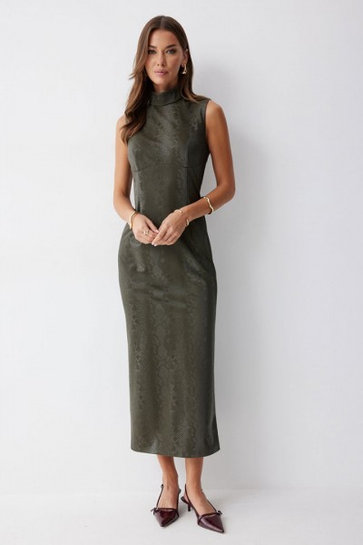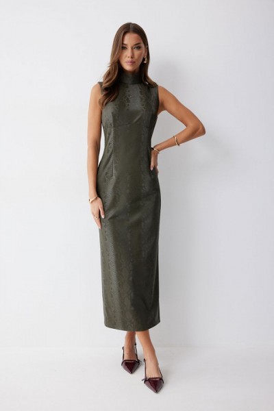 Платье прилегающего силуэта из экокожи длиной миди. Горловина-стойка. Спереди под грудью подрез, нагрудные и талиевые вытачки. На спинке в центральном шве потайная молния, по низу шлица. На спинке платья талиевые вытачки.