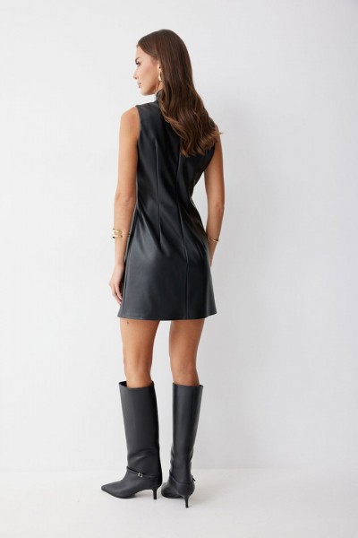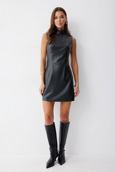 Платье прилегающего силуэта слегка расширенное книзу из экокожи длиной мини. Горловина-стойка. Спереди под грудью подрез, нагрудные и талиевые вытачки. На спинке в центральном шве потайная молния. На спинке платья талиевые вытачки. Обращаем ваше внимание, что фурнитура может отличаться от фото.