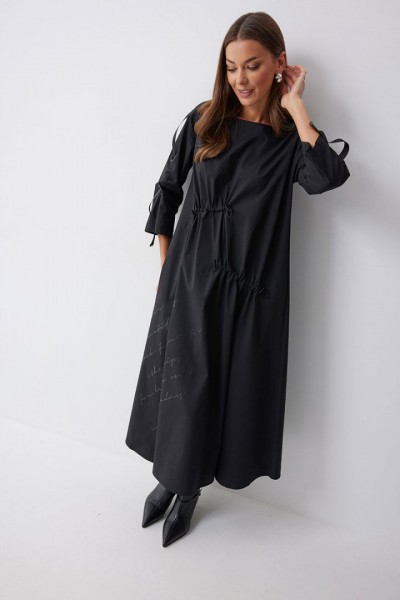 Платье А-силуэта из хлопковой ткани. Горловина округлая, на спинке застежка на молнию. Рукав со спущенной линией плеча длиной 7/8, с декоративными элементами и тесьмой. По переду и спинке декоративные кулисы с фиксаторами для регулирования степени прилегания изделия. По переду дизайнерская печать. Обращаем ваше внимание, что фурнитура может отличаться от фото.