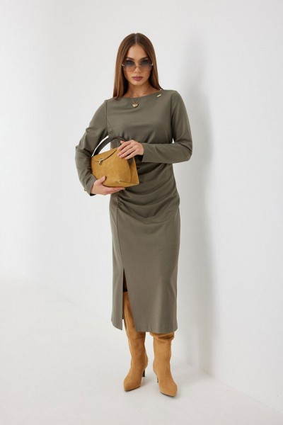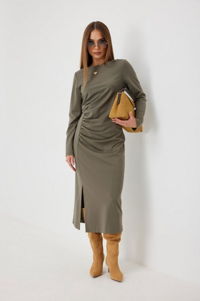Платье женское из приятной трикотажной ткани на подкладке. Рукав длинный, одношовный. По спинке средний шов и талевые вытачки, что создает приталенный силуэт. Драпировка и сборка на животе корректирует фигуру подчеркивая женственность. Разрез по ноге добавляет игривости, делая образ более динамичным.