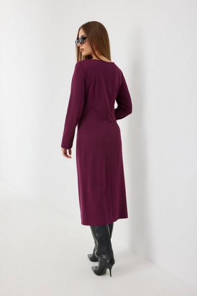 Платье женское из приятной трикотажной ткани на подкладке. Рукав длинный, одношовный. По спинке средний шов и талевые вытачки, что создает приталенный силуэт. Драпировка и сборка на животе корректирует фигуру подчеркивая женственность. Разрез по ноге добавляет игривости, делая образ более динамичным.