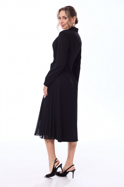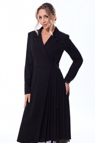 Платье с центральной двубортной застежкой по лифу переда на одну пришивную кнопку и на потайную молнию в правом боковом шве, втачным воротником и отложными лацканами. Платье отрезное по линии талии. По лифу переда- рельефы, выходящие из проймы. Нижняя часть переда с асимметричной вставкой- гофре. По линии талии- декоративный пояс- завязка на полукольцах. Спинка со средним швом, талиевыми вытачками. Рукав втачной, длинный.
