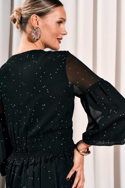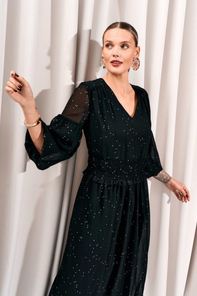 Платье с V- образным вырезом горловины и отрезной деталью собранной на венгерку по талии. Перед с кокеткой. Рукава втачные, состоящие из двух частей. Нижняя часть со сборкой и на подкладке. Платье на отлетной по низу подкладке.