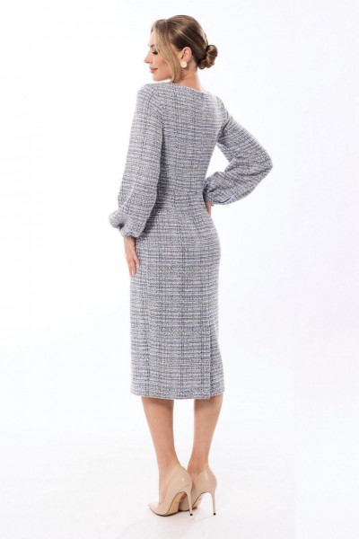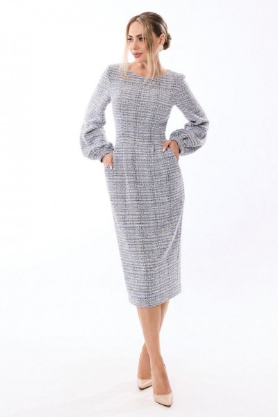 Платье, с застежкой на потайную молнию в среднем шве спинки, без воротника, с круглым вырезом горловины. Платье отрезное по линии талии. Лиф переда с талиевыми и нагрудными вытачками. Нижняя часть переда с двумя встречными складками, выходящими из талиевого шва, карманами от талиевого шва до бокового. Спинка со средним швом, заканчивающимся шлицей, талиевыми и нагрудными вытачками. Рукав втачной, длинный, с отрезной манжетой, застегивающейся на одну петлю и пуговицу. Низ рукава присборен.
