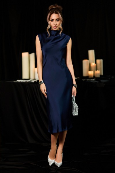 Элегантное платье миди насыщенного темно-синего цвета – идеальный выбор для изысканных мероприятий и официальных выходов. Модель выполнена без воротника и дополнена оригинальной фигурной драпировкой по горловине, что добавляет изящества образу. Платье застегивается на навесную петлю и пуговицу в среднем шве спинки, обеспечивая идеальную посадку и комфортное ношение. Нагрудные вытачки спереди и талиевые вытачки на спинке подчеркивают фигуру, делая акцент на талии.