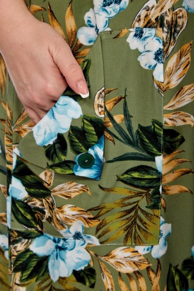 На полочке располагается функциональная планка до линии талии на пуговицах и нагрудные вытчки, снизу накладные карманы с фигурным клапаном на пуговице. Горловина фигурная с обтачкой. Спинка цельнокроеная. Рукав втачной одношовный, длиной по локоть.