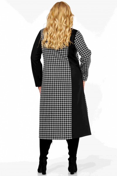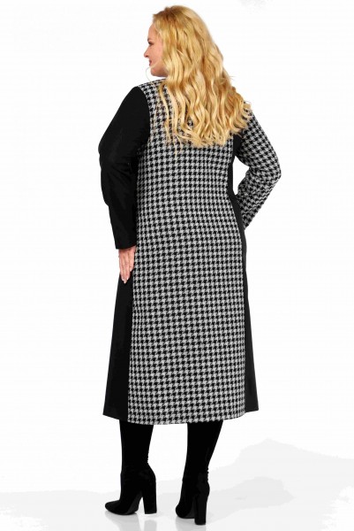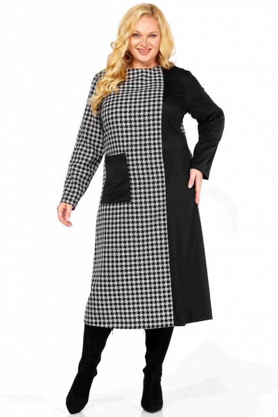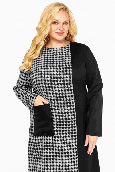 Геометрия стиля: Оригинальный дизайн с геометрическим разделением на черно-белую ""гусиную лапку"" и глубокий черный цвет – это игра контрастов, которая привлекает внимание и подчеркивает вашу индивидуальность. Вертикальные линии визуально стройнят фигуру, а продуманный крой обеспечивает идеальную посадку.