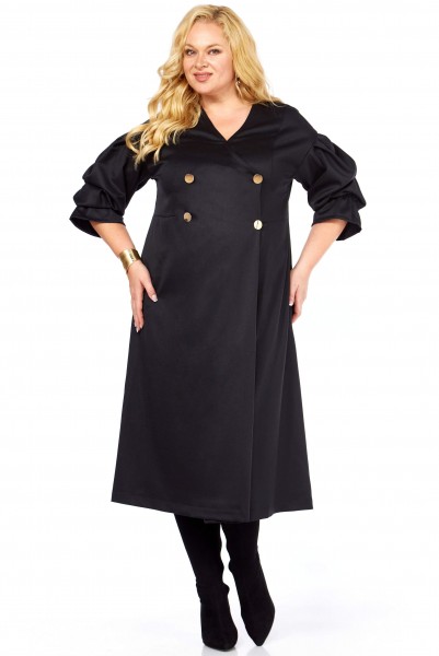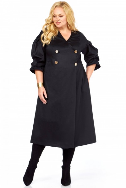 Игра акцентов и пропорций: Дизайн платья с двубортной застежкой и V-образным вырезом визуально стройнит силуэт и подчеркивает линию шеи. Рукава-фонарики добавляют нотку романтики и ретро-шика, а золотистые пуговицы – это яркий акцент, привлекающий внимание и добавляющий образу изысканности.