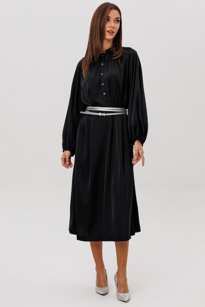 Платье из гладкого атласного полотна свободного рубашечного покроя. Модель выполнена с мягкой сборкой по горловине, застёжкой на пуговицы и объёмными рукавами на манжете. Акцентом выступают эффектные серебристые пояса, подчёркивающие талию и добавляющие образу современный, элегантный штрих. Ideal для деловых встреч, ужинов и особых выходов.