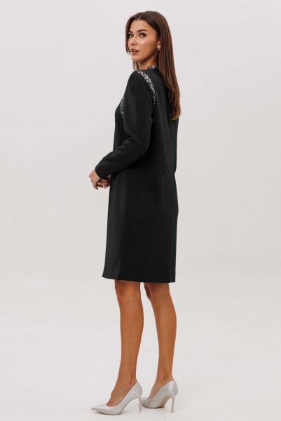 Свободный упрямленный силуэт, покрой-полуреглан, воротник-стойка, застежка по центру спинки на потайную молнию. По линиям пройм на полочке и спинке, стойка из отделочного полотна в пайетку. Полочка с нагрудной вытачкой.