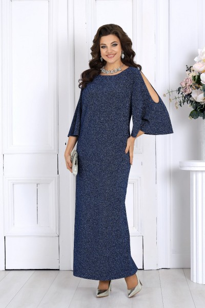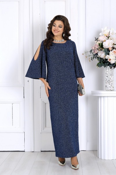 Платье женское полуприлегающего силуэта, выполнено из трикотажного полотна с фактурной лицевой стороной «люрекс». Модель на трикотажной подкладке, без застежки и плечевых накладок. Перед платья с нагрудными вытачками, направленными от проймы. Спинка с талиевыми вытачками и разрезом в нижней части среднего шва. Края V-образной горловины спинки фиксируются тремя перемычками из основного материала; горловина переда круглой формы. Рукав трехчетвертной, расширенный, с вырезом «капля» от плеча. Длина платья -- 144 см; длина рукава - 49 см.