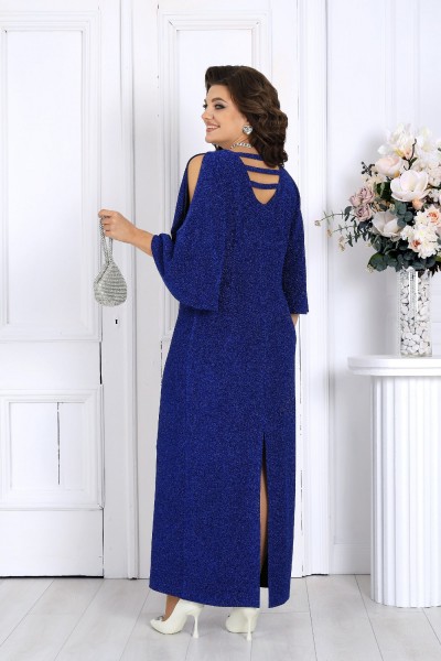 Платье женское полуприлегающего силуэта, выполнено из трикотажного полотна с фактурной лицевой стороной «люрекс». Модель на трикотажной подкладке, без застежки и плечевых накладок. Перед платья с нагрудными вытачками, направленными от проймы. Спинка с талиевыми вытачками и разрезом в нижней части среднего шва. Края V-образной горловины спинки фиксируются тремя перемычками из основного материала; горловина переда круглой формы. Рукав трехчетвертной, расширенный, с вырезом «капля» от плеча. Длина платья -- 144 см; длина рукава - 49 см.