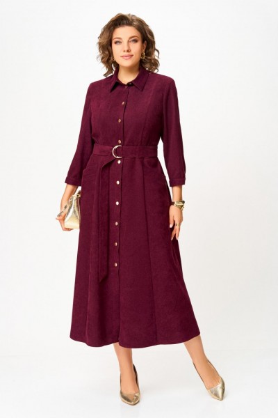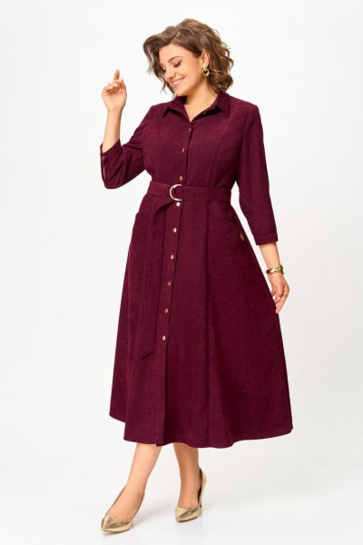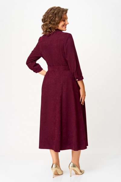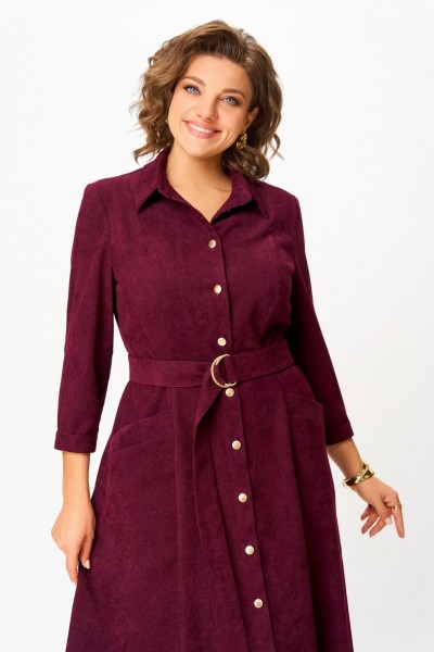 Платье из мягкой ткани вельвет, отрезное по линии талии с полуприлегающим лифом и юбкой А-силуэта, с центральной застёжкой на петли и декоративные пуговицы.