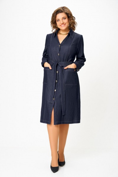 Платье из джинсовой ткани прямого силуэта с центральной застёжкой на петли и джинсовые пуговицы. Полочки с притачными фигурными планками, с рельефным швом и кокеткой, на уровне бёдер накладной карман с планкой и фирменной нашивкой «Swallow».
