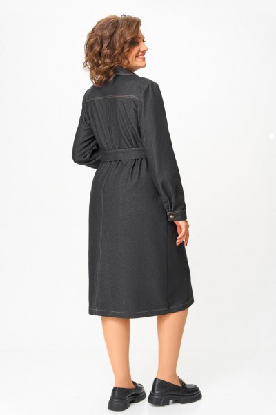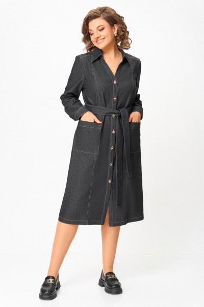 Платье из джинсовой ткани прямого силуэта с центральной застёжкой на петли и джинсовые пуговицы. Полочки с притачными фигурными планками, с рельефным швом и кокеткой, на уровне бёдер накладной карман с планкой и фирменной нашивкой «Swallow».