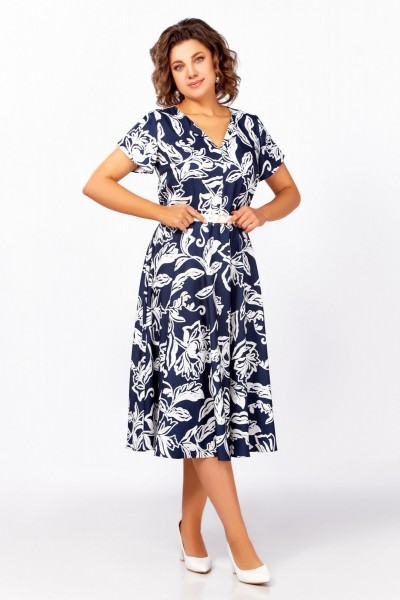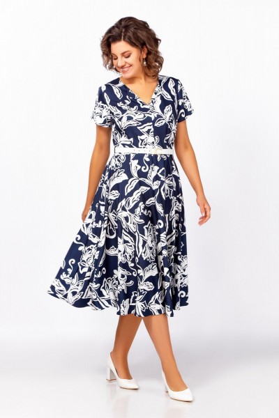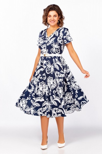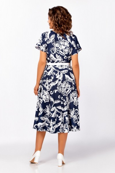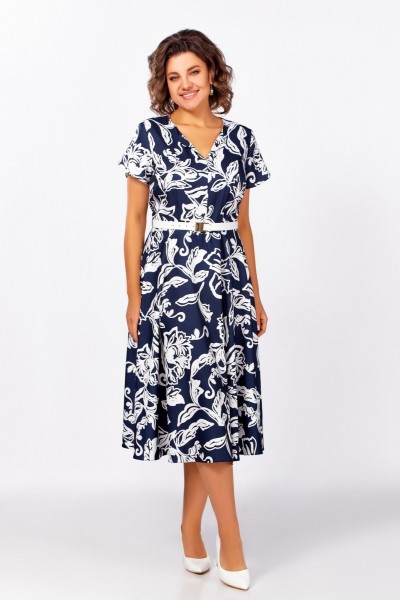 Платье из струящейся вискозной ткани, отрезное по линии талии. Лиф полуприлегающего силуэта. По полочке лифа центральный шов, нагрудные и талиевые вытачки, по спинке средний шов и талиевые вытачки. Горловина V-образной формы с отложным воротничком. Юбка расклешённая. Рукав втачной короткий, формы «тюльпан». В среднем шве спинки застёжка на потайную тесьму-молнию.