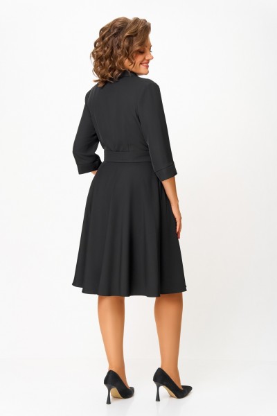 Платье из мягкой поливискозной ткани, Х-образного силуэта с полуприлегающим лифом. Платье отрезное по линии талии. Перед лифа с вертикальными рельефами и застёжкой на петли и 4 декоративные пуговицы. Горловина V-образной формы, с отложными лацканами и воротником пиджачного типа. Спинка лифа с талиевыми выточками. Рукав втачной, длиной ¾, по низу манжет с разрезом. Застёжка в боковом шве на потайную тесьму-молнию.