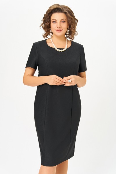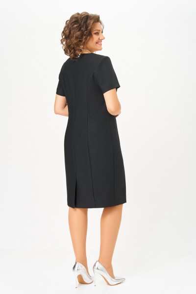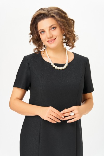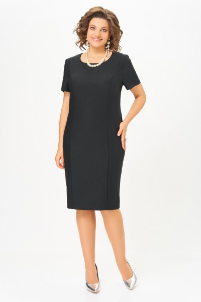 Платье полуприлегающего силуэта из мягкой поливискозной ткани. По полочке выполнены рельефные швы, по спинке рельефные швы, средний шов со шлицей и застёжка на потайную тесьму-молнию. Горловина круглая, обработана обтачкой. Рукав втачной, короткий. В подарок украшение – жемчужное колье. Длина платья по спинке – 101(+/-1) см. Длина рукава – 22(+/-1) см.