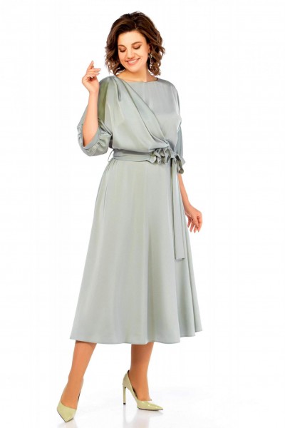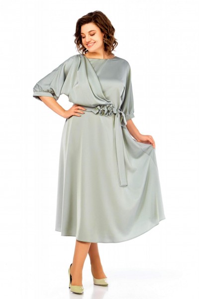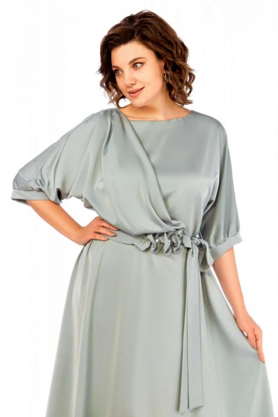 Нарядное платье из струящейся ткани, отрезное по линии талии. Верх летучая мышь, по низу рукава сборка и притачная манжета. Вырез горловины округлой формы. По переду ассиметричная деталь от плеча до линии подреза. По линии подреза резинка. Нижняя часть платья клеш. К платью прилагается интересный пояс, украшенный стразами.