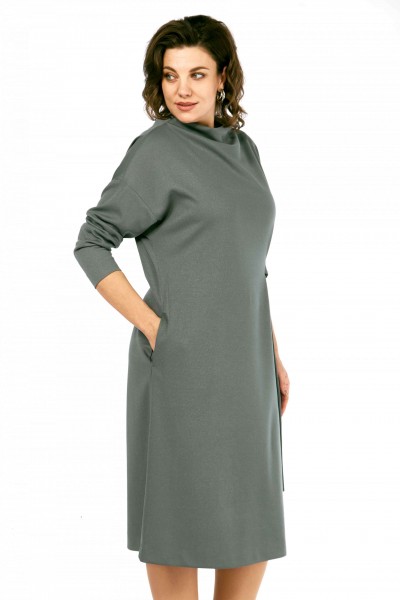 Платье женское, прямого силуэтв со спущенным длинным рукавом. Цельнокроенный воротник-стойка. Слевой стороны в области талии слева декор, в виде ниспадающего пояса. Карманы в боковых швах. Молния в левом боковом шве внизу функциональная молния, которая при растегивании превращается в разрез.