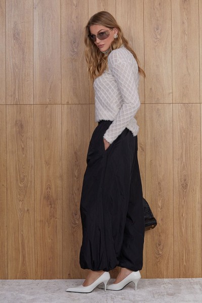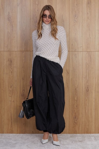 Джемпер прямого силуэта, немного заужен книзу, выполнен из мягкого и комфортного трикотажного полотна. Ажурная ткань с бархатистой поверхностью и очень приятная к телу. Перед и спинка изделия прямые. Чуть спущенная линия плеча. Втачной длинный рукав. Горловина высокая двойная стойка.