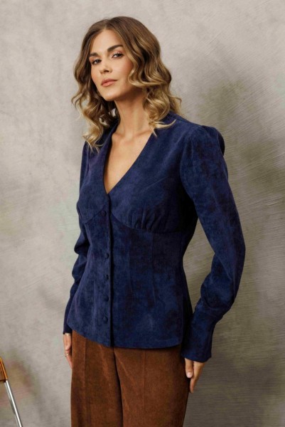 Блузка оригинальная приталенного силуэта из вельветовой ткани. Перед с подрезом под грудью, сборкой в районе груди и талиевыми вытачками. Затсежка на петли и пуговицы. Горловина V-образной формы. Спинка с талиевыми вытачками. Рукав втачной со сборкой по окату и с манжетой по низу. Манжета высокая с двумя петлями и пуговицами.