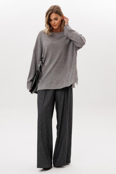 Джемпер выполнен из трикотажного полотна в рубчик. Джемпер прямого силуэта , покроя "oversize" длиной ниже линии бедер. Перед и спинка цельные. Горловина округлой формы, обработана широкой бейкой. Плечевой шов удлинен. Рукав рубашечного покроя, одношовный. В боковых швах разрезы.