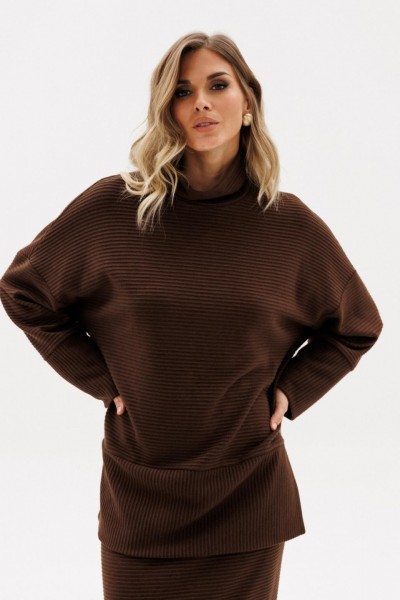 Джемпер выполнен из трикотажного полотна в рубчик. Джемпер прямого силуэта, покроя "oversize", длиной до линии бедер. Спереди и на спинке отрезные части. Воротник-стойка. Плечевой шов удлинен. Рукав рубашечного покроя, одношовный, с широкой манжетой по низу. В боковых швах разрезы.