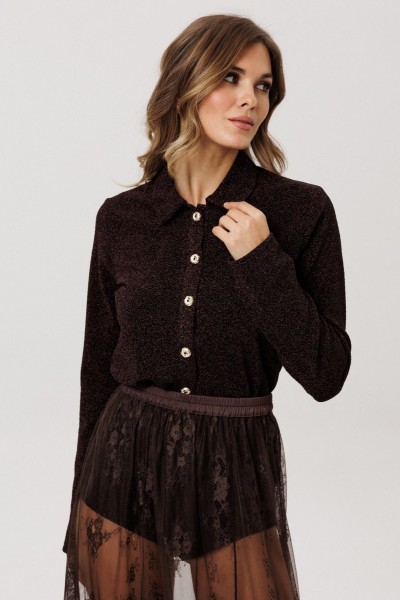 Джемпер выполнен из трикотажного полотна с блеском. Джемпер полуприлегающего силуэта, длиной выше линии бедер. Воротник стояче-отложной. Плечевой шов удлинен. Рукав втачного покроя, одношовный. Застежка по планке на петли и декоративные пуговицы.